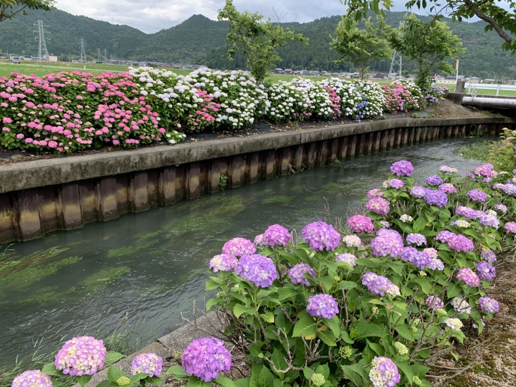 こちら、きぬがさトンネル近くの紫陽花の植樹のある川。